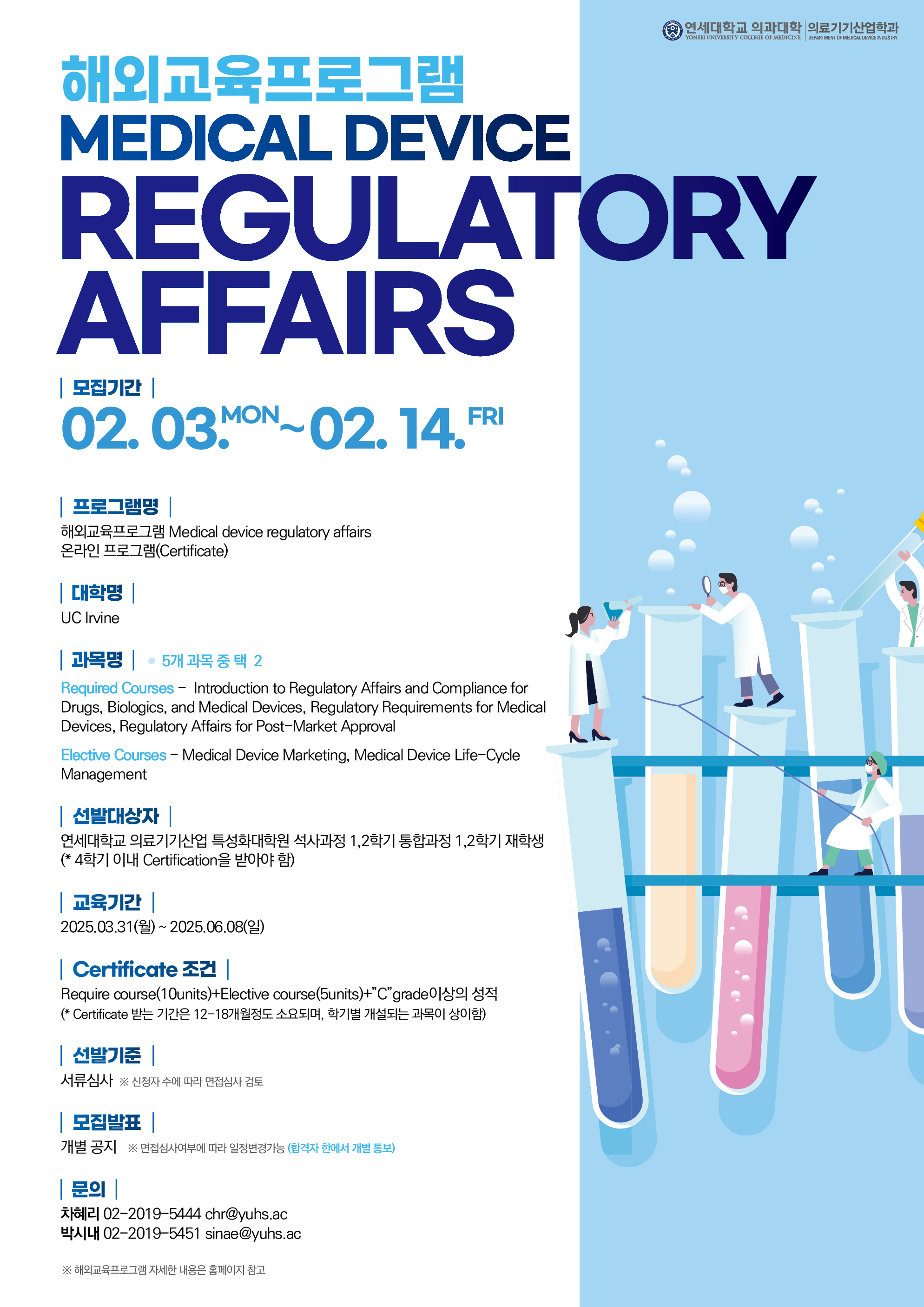 연세대학교 의료기기산업특성화대학원 석사과정 1,2학기 통합과정 1,2학기 재학생 (*4학기 이내 Certification 받아야 함.)