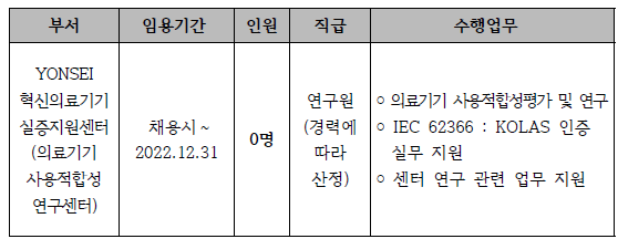 > 정보마당 > 취업정보YONSEI혁신의료기기실증지원센터(의료기기사용적합성연구센터) 신규 직원 채용을 다음과 같이 공고합니다.